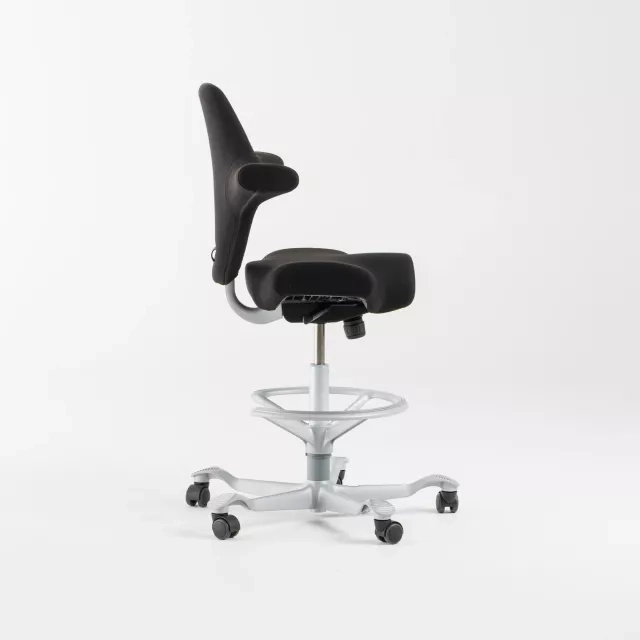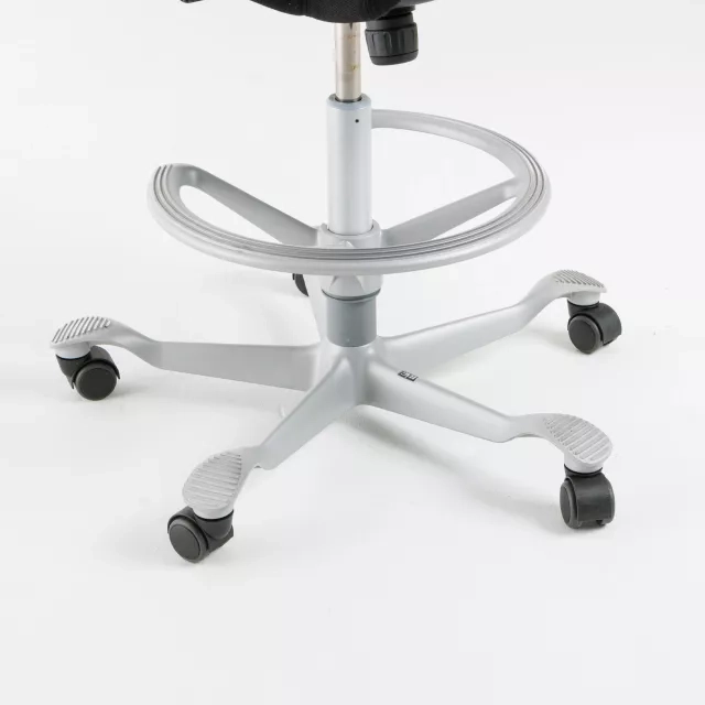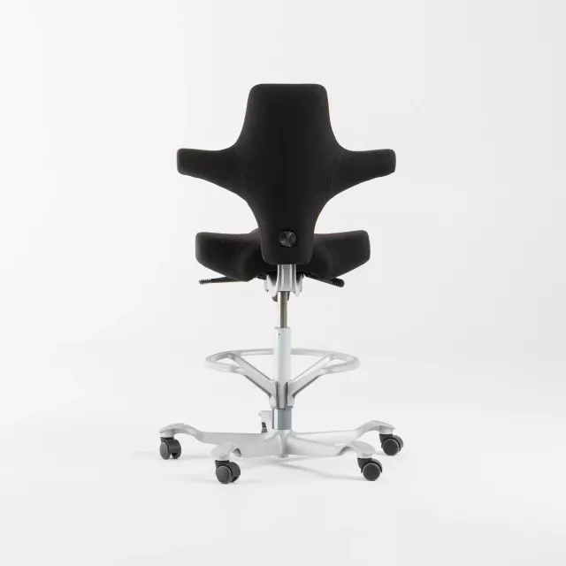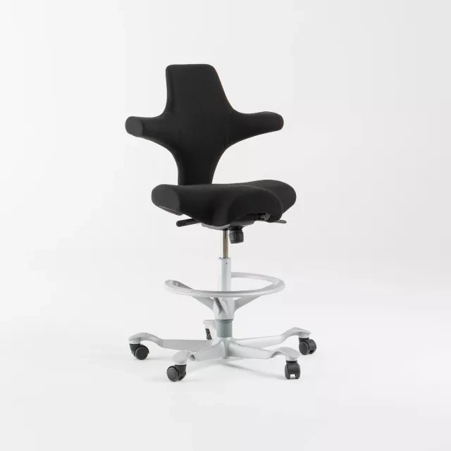 Kontorsstolen Capisco 8106 från HÅG med fotring, formgiven av Peter Opsvik, är klädd i svart tyg för ett sobert och enhetligt uttryck. Den begagnade HÅG Capisco 8106 stödjer varierade sittpositioner och smidiga skiften under arbetsdagen. Fotringen gör den lämplig för höj- och sänkbara bord och högre arbetsytor. Den sadelformade sitsen och det rörliga ryggstödet främjar rörelse och en mer öppen höftvinkel vid längre pass. Varje stol är funktionskontrollerad och rengjord av våra tekniker för att möta kraven i projektleveranser. Genom att välja en återbrukad Capisco 8106 från HÅG förlänger du produktens livslängd och bidrar till en cirkulär inredning. Den svarta klädseln är tålig och harmonierar enkelt med befintlig kontorsmiljö. HÅG Capisco 8106 med fotring passar bra i aktivitetsbaserade kontor, möteszoner och kreativa ytor.