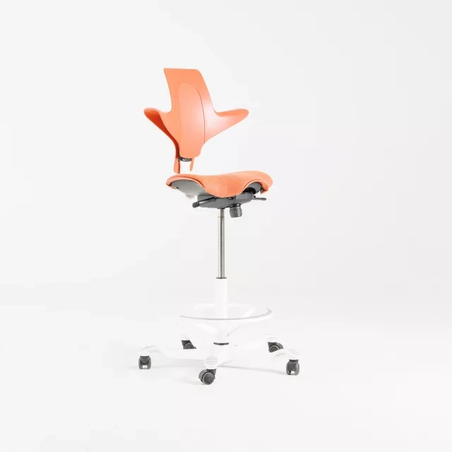 Kontorsstolen Capisco Puls 8020 från HÅG med hög kolv passar agila arbetsmiljöer. Denna återbrukade modell är vit med sits klädd i orange tyg. Capisco Puls 8020 från HÅG är formgiven av Peter Opsvik och stödjer aktivt sittande under dagen.