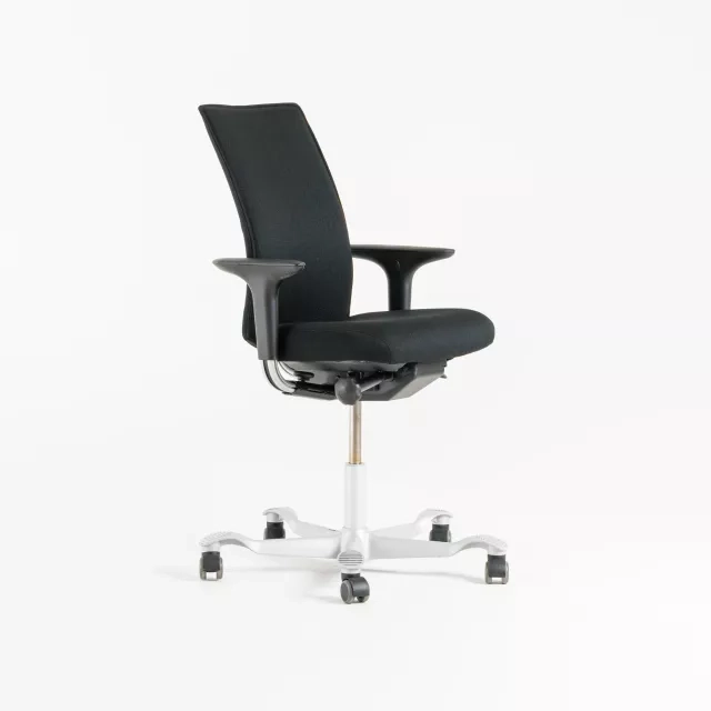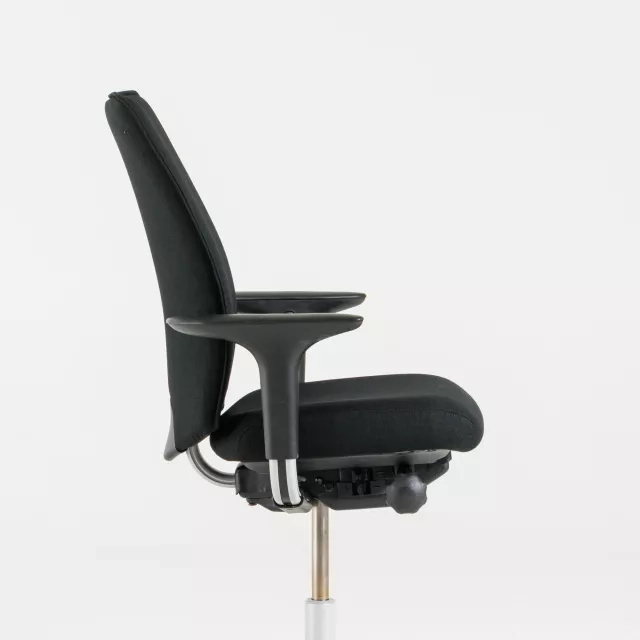 Kontorsstolen H05 5600 från HÅG kombinerar ergonomiskt stöd med ett modernt uttryck för professionella miljöer. Stolen är formgiven av Peter Opsvik för HÅG och är välkänd i skandinaviska kontor. Denna återbrukade modell är helklädd i svart Lido-tyg för ett enhetligt intryck. Ett bra val när du behöver pålitlig sittkomfort med ett sobert utförande.