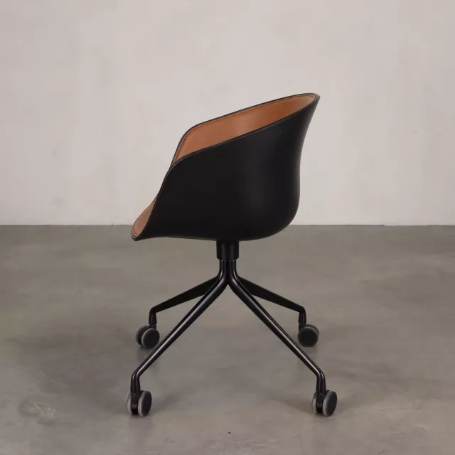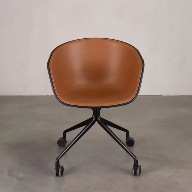 Konferensstolen About a Chair från HAY, formgiven av Hee Welling, är en återbrukad och flexibel mötesstol på hjul. Framsidesklädd i brunt läder ger den bekvämt stöd under längre möten och workshops. Den diskreta formen smälter in i många interiörer och kontorsmiljöer. Den fungerar väl för fokuserat arbete och samarbete.