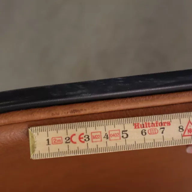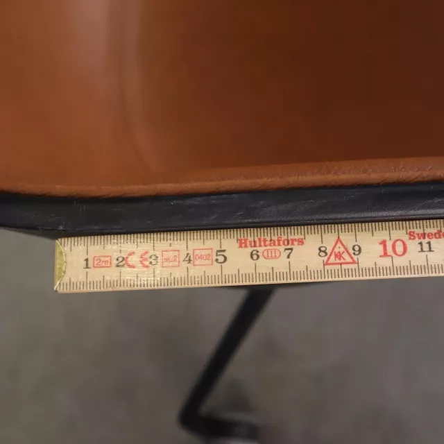 Denna HAY About a Chair mötesstol har ett gott helhetsintryck med mindre märken på plastskalet. Se bilder för detaljer kring dessa ytliga spår. Det bruna lädret framtill är slitstarkt och lämpar sig väl för daglig användning. Hjulen gör det enkelt att anpassa rummet efter gruppens behov.