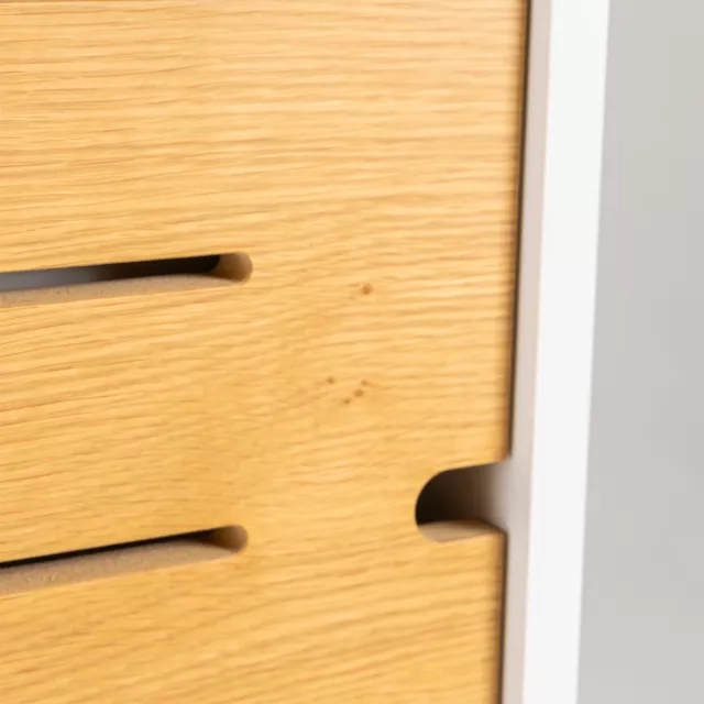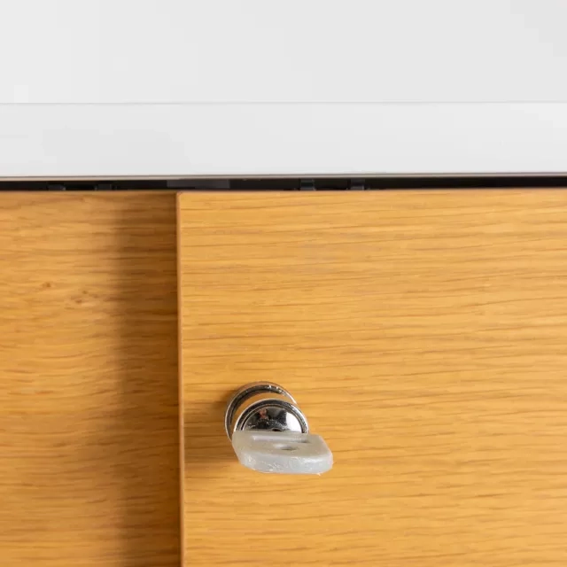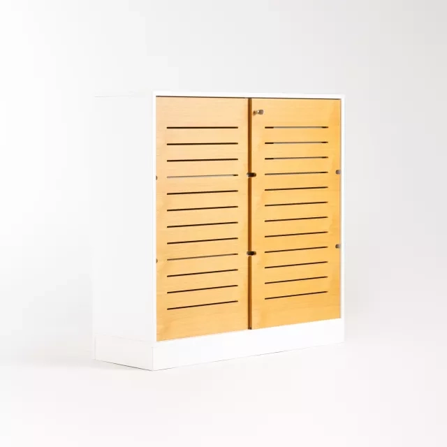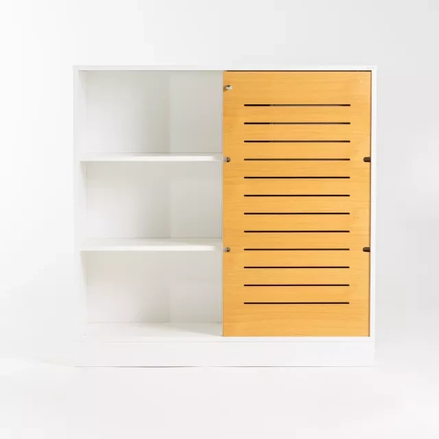 Skjutdörrarna håller passager fria och material förvaras diskret. Det återbrukade skåpet stödjer ett cirkulärt arbetssätt och fungerar bra för pärmar, kontorsmaterial och delade ytor.