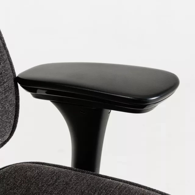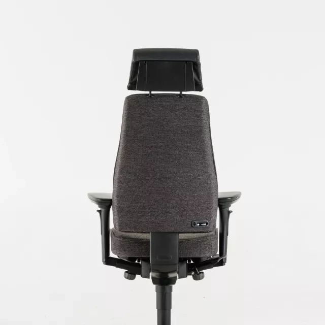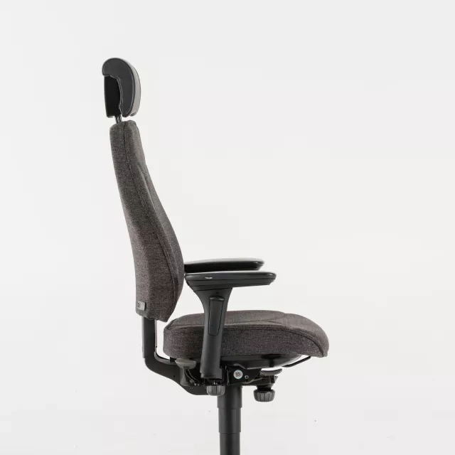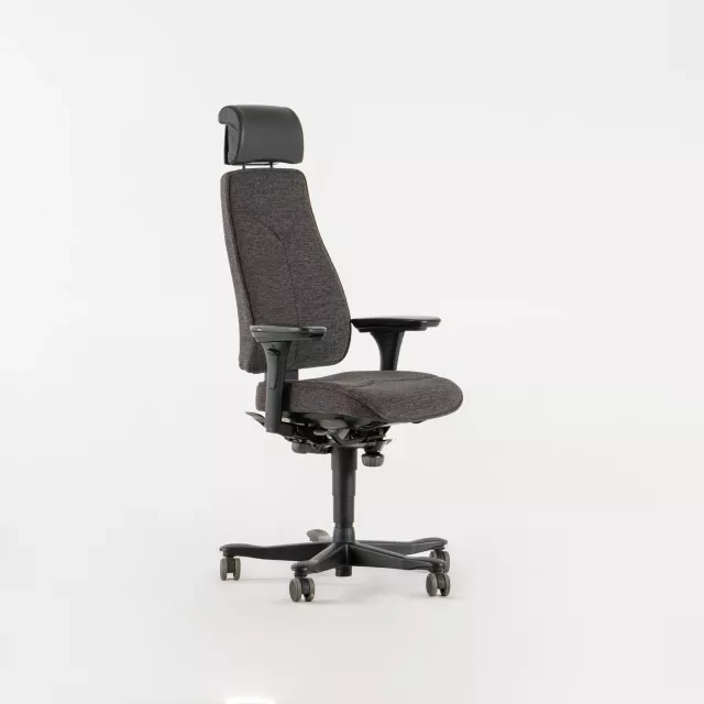Den höga ryggen stödjer övre rygg och axlar under långa pass. Justerbara armstöd och ett justerbart nackstöd gör det enkelt att finjustera sittställningen. Ett återbrukat val minskar miljöpåverkan och ger hållbar prestanda för krävande kontorsmiljöer.