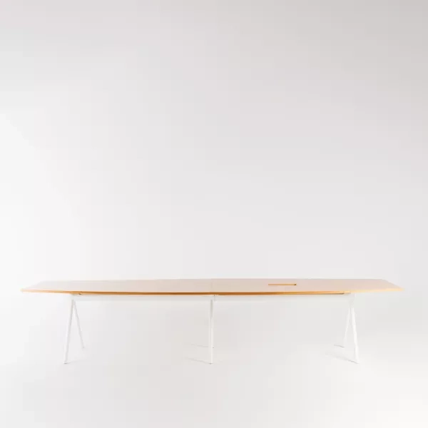 Detta begagnade konferensbord har en avskalad, minimalistisk design i vitt och grått laminat. Den slitstarka ytan står emot fläckar och är enkel att torka av, vilket gör det lätt att hålla rent i intensiva miljöer. Det neutrala uttrycket passar i mötesrum, projektytor och kan även användas som matbord i personalutrymmen. Ett praktiskt val för cirkulära kontorsmiljöer där lång livslängd och enkel skötsel prioriteras.