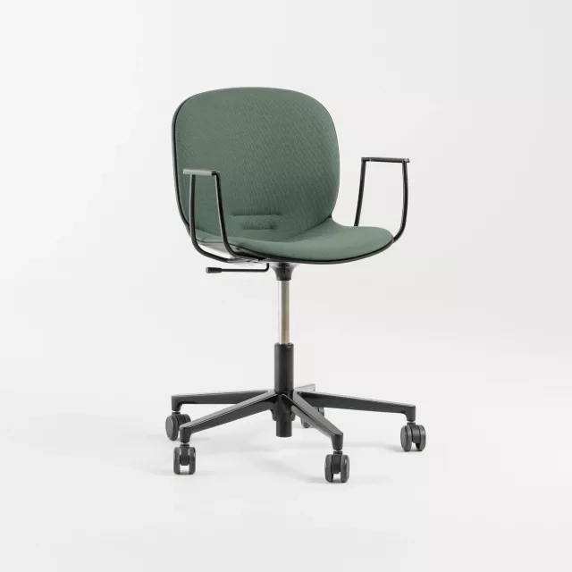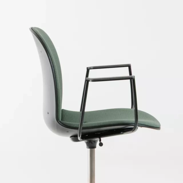 The Noor conference chair on castors delivers agile movement in meeting rooms and project spaces. It features a black star base with castors, armrests and height adjustment. The chair is front-upholstered in green fabric for a distinctive look.