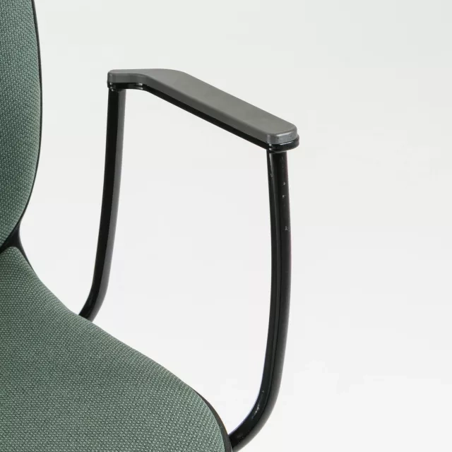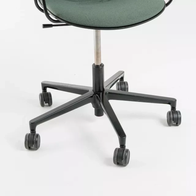 Noor conference chair on castors with black star base, armrests and green fabric. Height adjustable and reused, suited to agile meeting and project spaces.