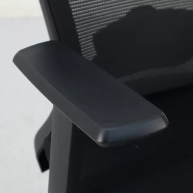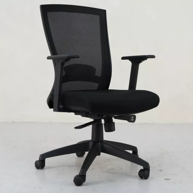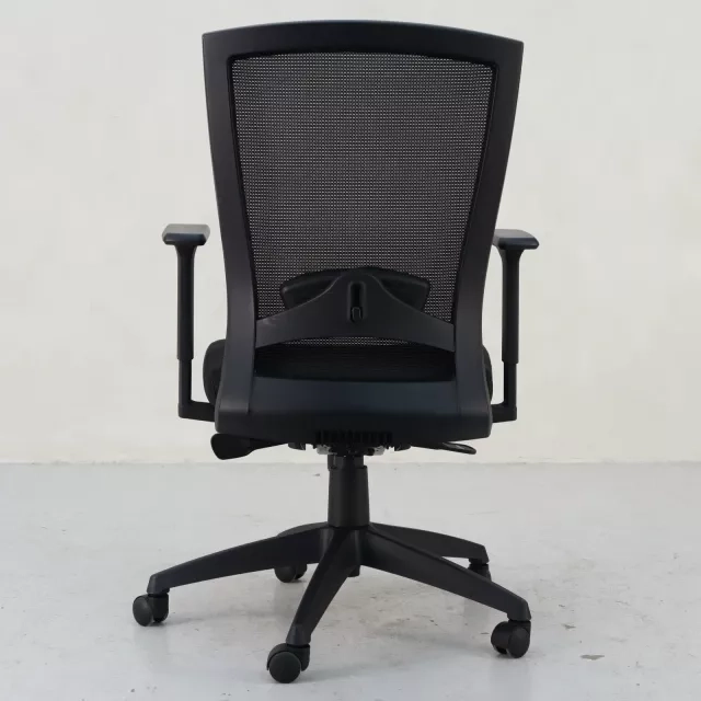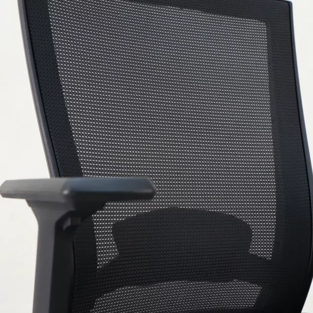 Den justerbara, återbrukade kontorsstolen lämpar sig både för skrivbordsarbete och som konferens- eller mötesstol. Den helsvarta skrivbordsstolen erbjuder en kombination av stil och ergonomi, med en sval meshrygg och bekväm tygsits. Den är utrustad med justerbara armstöd, svankstöd, justerbar höjd samt låsbar gungfunktion för mångsidig användning i professionella miljöer.