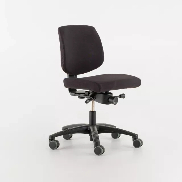 Denna begagnade kontorsstol i svart tyg är ett smidigt val för fokuserat arbete och rörliga kontorsmiljöer. Den kompakta storleken passar skrivbord, touchdownytor och mötesrum.