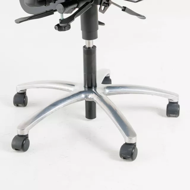 Seat angle and depth are adjustable, with a Multimatic mechanism and a lockable knee tilt. Adjustable armrests and a headrest help maintain a supported posture during longer tasks. Minor nicks and paint wear are present on the base. The Plus 382+ suits offices, meeting rooms and home workspaces where adjustability is valued.