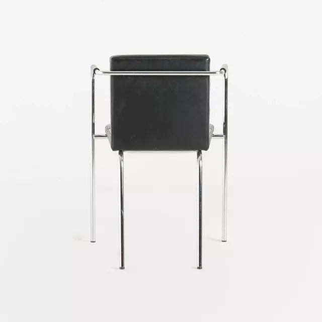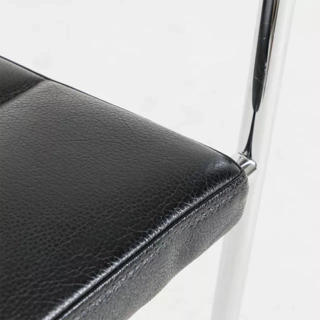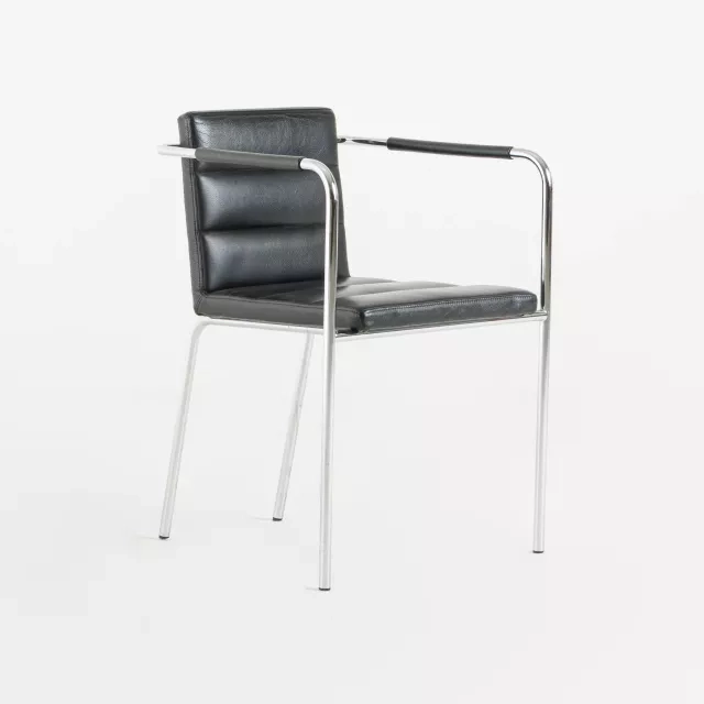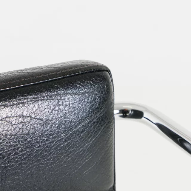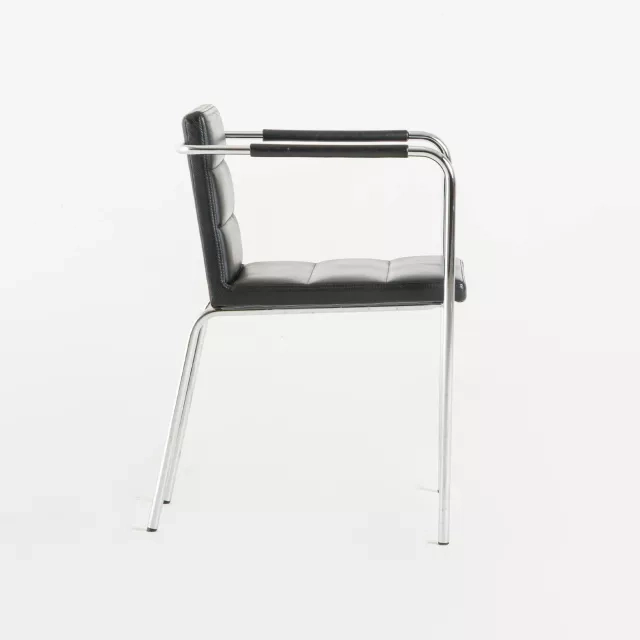 Den kromade stålstommen ger långvarig stabilitet vid daglig användning. Läderklädseln ger taktil komfort och kan underhållas med vanliga rutiner i professionella miljöer. Sitsens geometri och armstöden stödjer en upprätt och avspänd hållning under längre möten. Den kompakta ytåtgången fungerar bra i täta möbleringar. Armstöden ger stabilt stöd när man reser sig mellan pass.