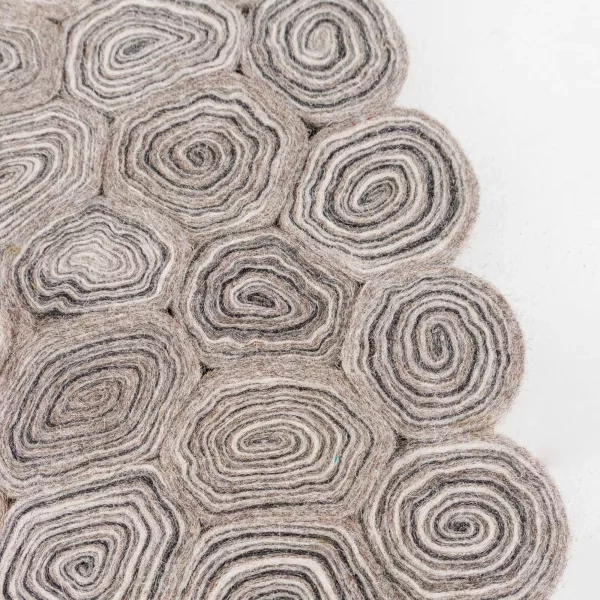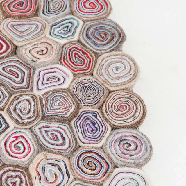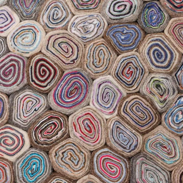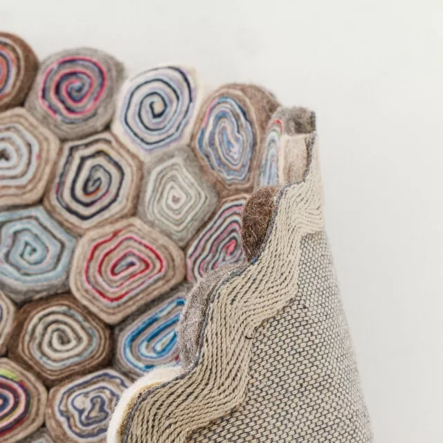 Woodstock Multi är en ullmatta utvecklad för moderna arbetsplatser och offentliga miljöer. Handtovade ullrundlar fogas samman till ett mönster som påminner om årsringar med tydlig struktur och djup. Rundlarna fästs på en textilbaksida som stabiliserar ytan för användning i projekt och kontraktsmiljöer. Ull ger slitstyrka, värme och naturlig smutsavvisning, vilket gör mattan lämpad för daglig användning. Placera den i receptioner, loungeytor eller informella möteszoner för mjukare akustik och tydlig rumsindelning. Regelbunden dammsugning håller ytan fräsch och den robusta uppbyggnaden stödjer en lång livslängd.