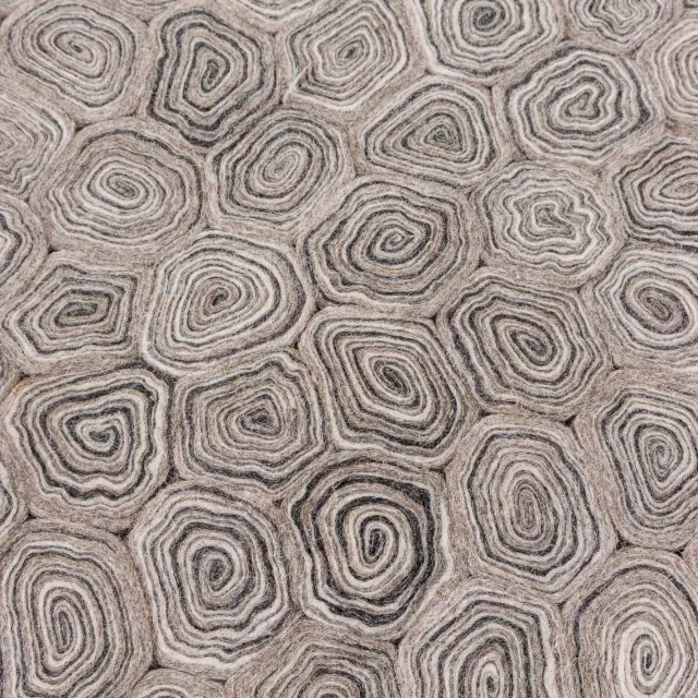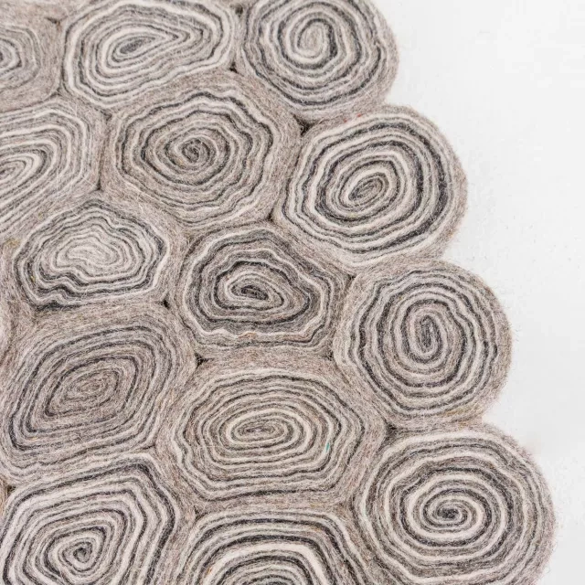 Mattan Woodstock är en ullmatta av tovad ull där runda segment bildar ett mönster som påminner om en trästam i genomskärning. Segmenten är fästa på en textil baksida som ger stabilitet och en behaglig, lätt dämpad känsla när du går. Strukturen skapar tydlig taktilitet, minskar ljudnivån och bidrar med värme i receptioner, mötesytor och öppna kontor. Ullens naturliga slitstyrka och smutsavvisande egenskaper gör mattan lämplig för frekvent användning i professionella miljöer. Använd den för att zonindela, mjuka upp akustiken och komplettera återbrukade möbler i en hållbar inredning.