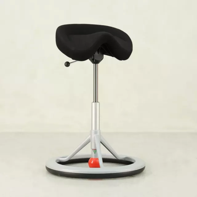 BackApp balansestol er en ergonomisk sadelstol som forbedrer arbeidsplassen din i kombinasjon med et hev- og senkbart skrivebord. Dette eksemplaret er utstyrt med et sete trukket i slitesterkt svart Alcantara-stoff. Ved å bruke stolens tyngdepunkt som balanserer på en kule, fremmer BackApp-stolen en aktiv sittestilling, noe som reduserer belastning og oppmuntrer til stadige bevegelser gjennom arbeidsdagen. Dette gjør den til en egnet løsning for bedrifter som vil forbedre holdning og komfort på arbeidsplassen.