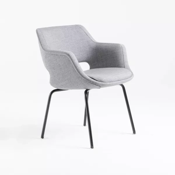 Konferansestolen Lottus, designet av Lievore Altherr Molina for Enea, er nøye utformet for å løfte møterom med sitt sofistikerte design og behagelige sete. Trukket i mørkegrått stoff med et spennende understell i en kombinasjon av oransje og grått, er denne stolen ikke bare estetisk tiltalende, men også praktisk, da den kan stables for enkel oppbevaring.