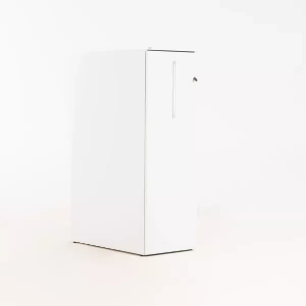 This practical, refurbished tower cabinet from Edsbyn is a sleek storage solution in a subtle grey tone, designed to accommodate three rows of A4 binders. The cabinet is lockable with a key and is ideally placed to the right of your desk, offering both accessibility and security.