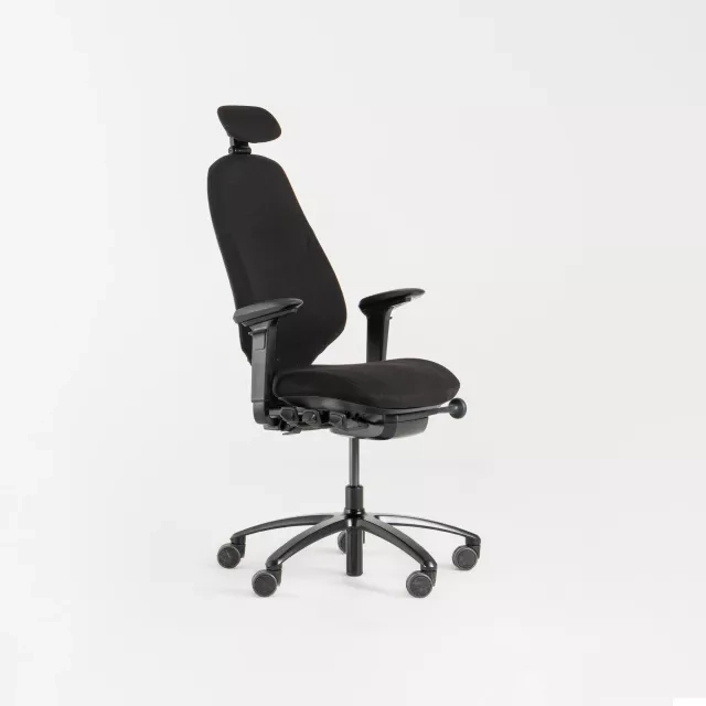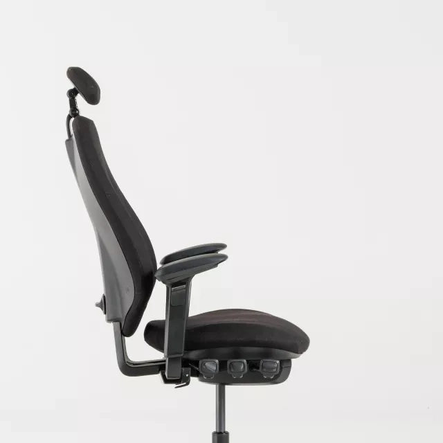 Stolen är helklädd i svart tyg för ett enhetligt, professionellt uttryck. Den levereras med armstöd och nackstöd samt erbjuder flera justeringar som hjälper användaren till en balanserad sittställning. Robusta material och stabil konstruktion gör den lämplig för daglig användning på kontor, projektrum och fokusytor.
