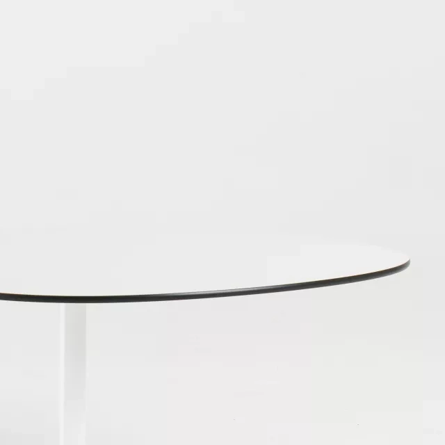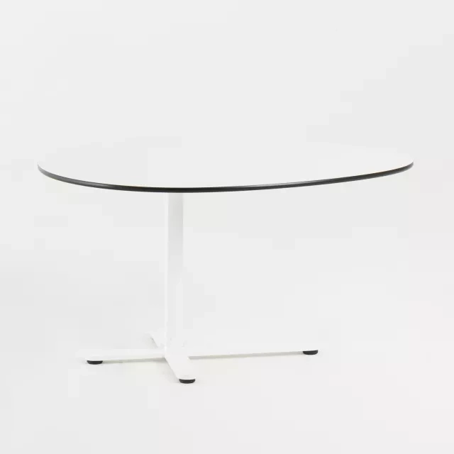 Detta begagnade soffbord har en nätt form som är lätt att placera i små ytor. Vit skiva med svart kant ger ett tydligt och rent uttryck. Passar receptioner, loungeytor och informella mötesplatser i kontoret.