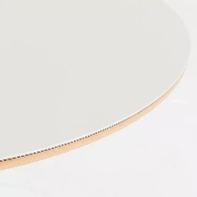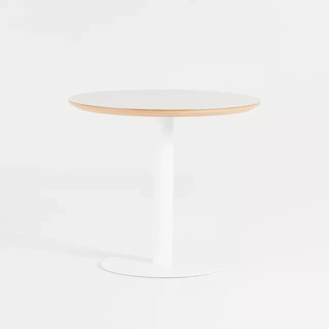 Detta renoverade soffbord passar bra i lounge, reception och informella mötesytor. Bordsskivan är nyrenoverad med ny desktoplinoleum i färgen Mushroom. Pelarbenet är vitlackerat för stabilitet och ett rent, professionellt uttryck.