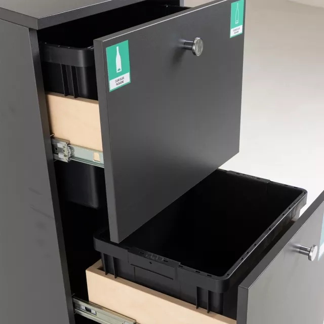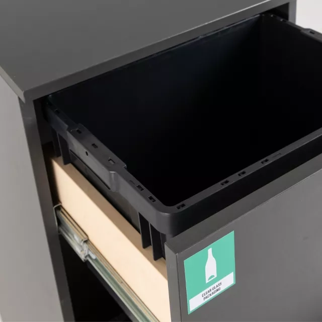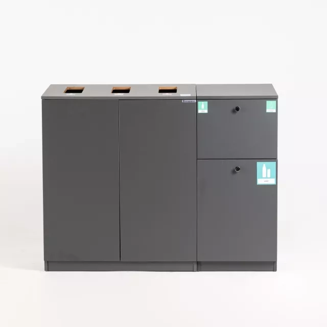 Detta återbrukade sorteringsskåp från Longopac skapar ordnad källsortering på kontor, skolor och offentliga miljöer. Den tåliga konstruktionen klarar daglig användning och främjar ett effektivt flöde. Utformat för yteffektiv placering längs väggar eller i gemensamma ytor.