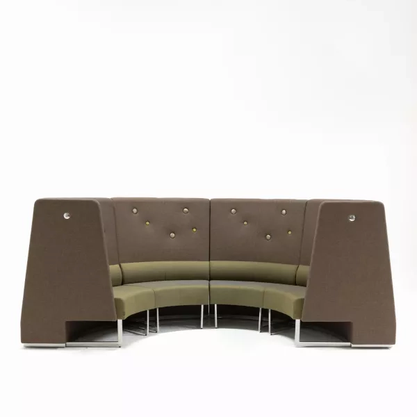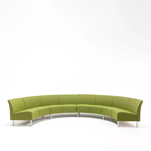 Hörnsoffan Gap från Swedese är ett begagnat sittmöbelval för receptioner och loungeytor. Tyget i tre gröna nyanser ger ett rofyllt men uttrycksfullt intryck. De vita medarna lättar helhetsintrycket och bidrar till en modern karaktär. Hörnlösningen använder golvytan effektivt och rymmer fler sittplatser där ytan är begränsad.
