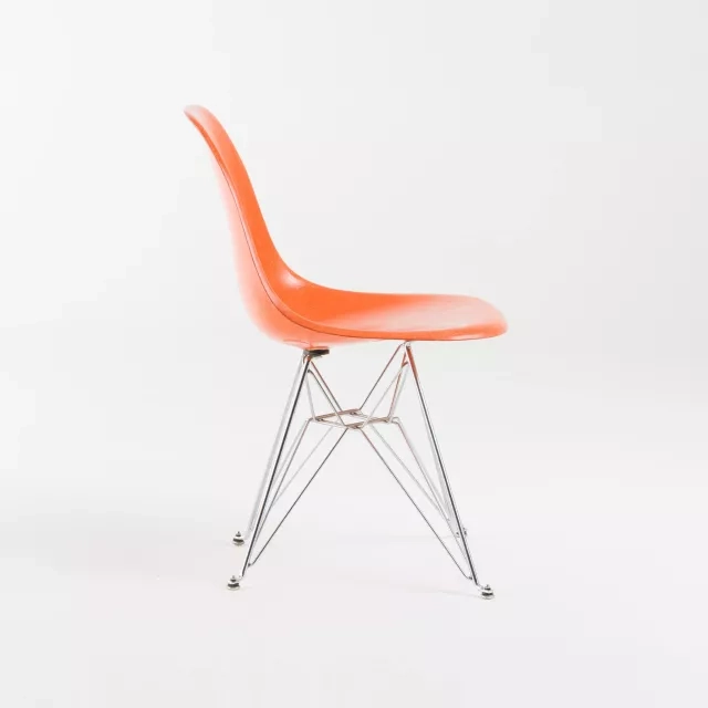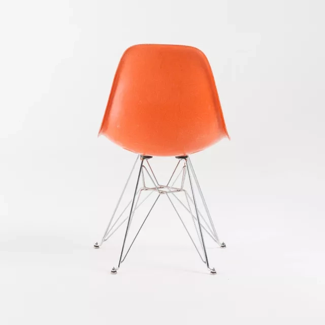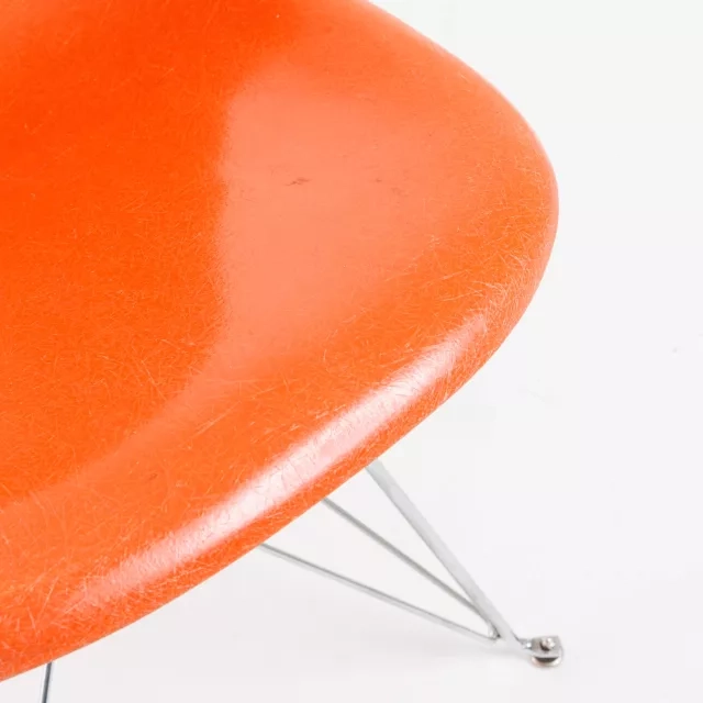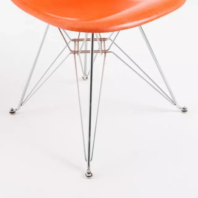 Vitra Eames Fiberglass Chair DSR with red-orange seat and chrome base. Pre-owned examples, older model with height that may differ.