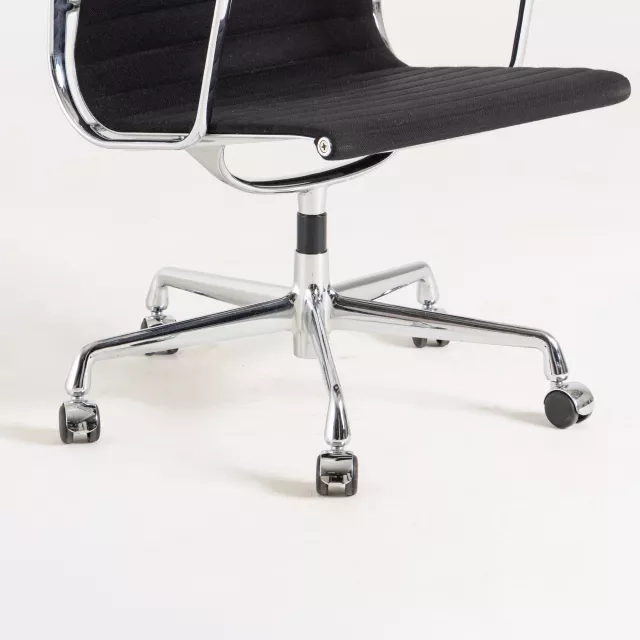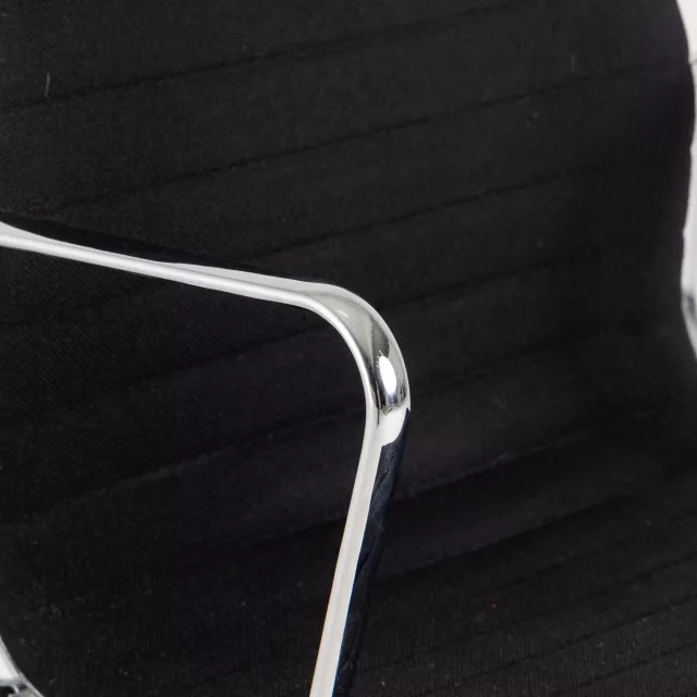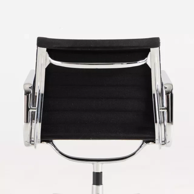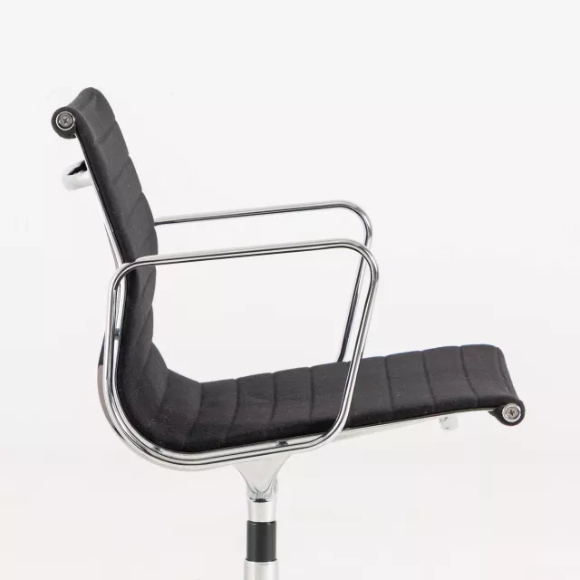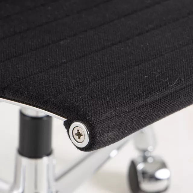 Konferensstolen EA 108 från Vitra på hjul är en erkänd klassiker av Charles och Ray Eames. Detta begagnade exemplar är klätt i svart canvas och har ett snurrstativ i polerat aluminium på hjul. Stolen är etikettmärkt Vitra, vilket säkerställer äkthet och jämn kvalitet. Den lämpar sig för mötesrum, styrelserum och representativa ytor.