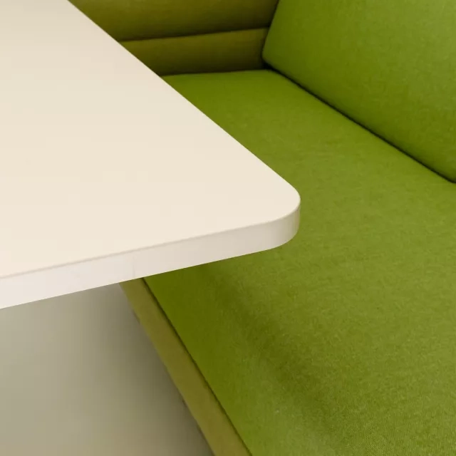 Bekväm sits- och ryggklädsel kombineras med flexibla sido- och bakstycken. Tillsammans skapar de en lugn och avskärmad zon. Designen dämpar visuella intryck och stödjer snabba möten, fokuserade samtal och informella diskussioner.