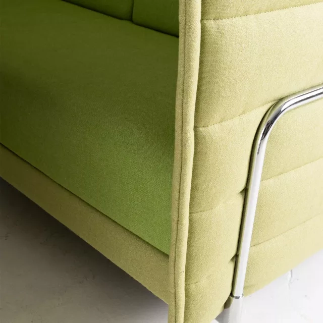 Soffan Alcove från Vitra passar i lounger, samarbetsytor och projektzoner. Det återbrukade valet förlänger produktens livslängd och bidrar till en mer cirkulär arbetsplats. Möbeln smälter väl in i moderna kontorsmiljöer och entréer med hög belastning.
