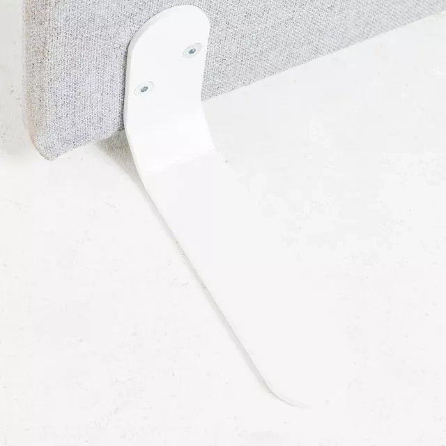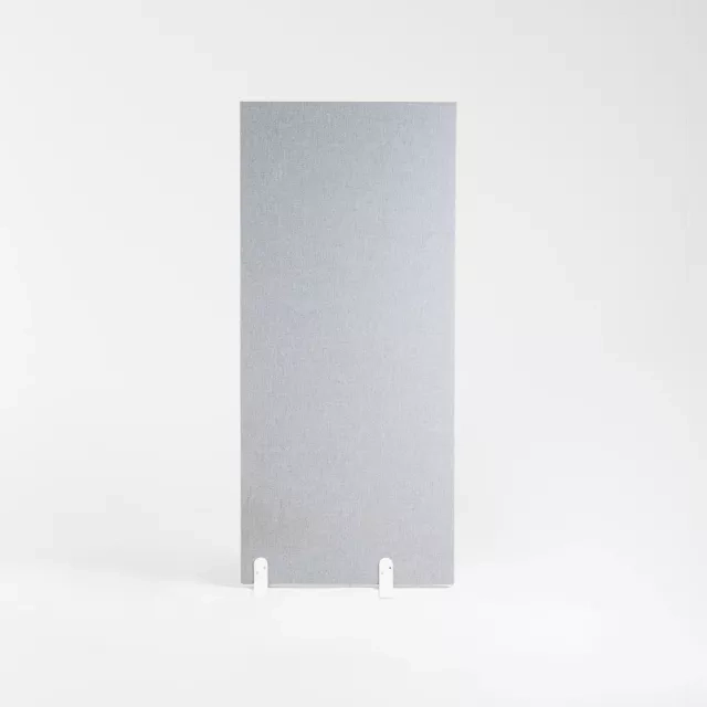 Återbrukad och effektivt ljudabsorberande golvskärm från Zilenzio för kontor med hög aktivitetsnivå. Skärmen har grå tygklädsel och vita metallfötter, och är lätt att placera.